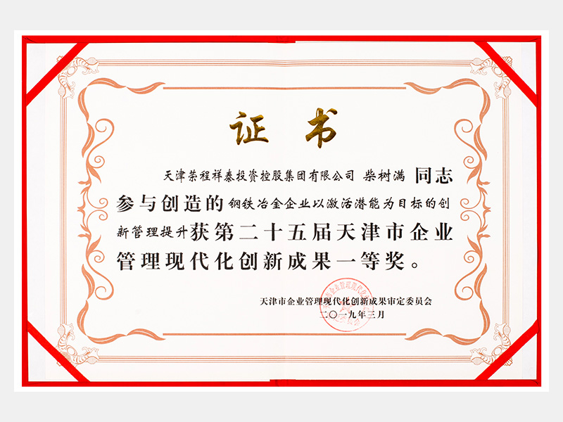 柴樹滿同志參與創(chuàng)造的鋼鐵冶金企業(yè)以激活潛能為目標的創(chuàng)新管理提升獲第二十五屆天津市企業(yè)管理現(xiàn)代化創(chuàng)新成果一等獎。