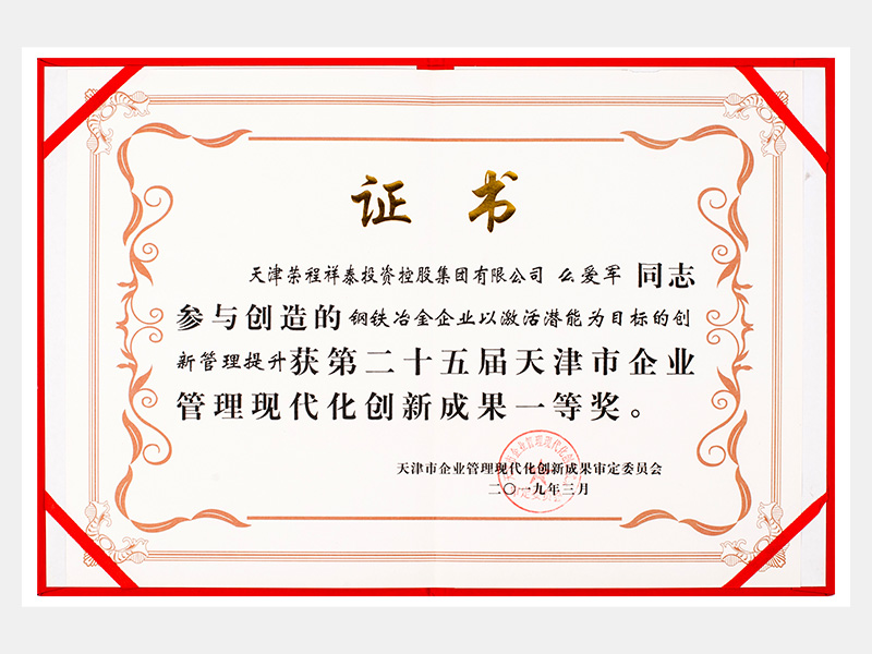 么愛軍同志參與創(chuàng)造的鋼鐵冶金企業(yè)以激活潛能為目標(biāo)的創(chuàng)新管理提升獲第二十五屆天津市企業(yè)管理現(xiàn)代化創(chuàng)新成果一等獎(jiǎng)。