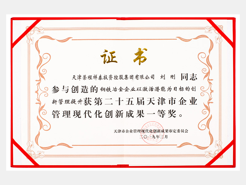 劉剛同志參與創(chuàng)造的鋼鐵冶金企業(yè)以激活潛能為目標(biāo)的創(chuàng)新管理提升獲第二十五屆天津市企業(yè)管理現(xiàn)代化創(chuàng)新成果一等獎(jiǎng)。